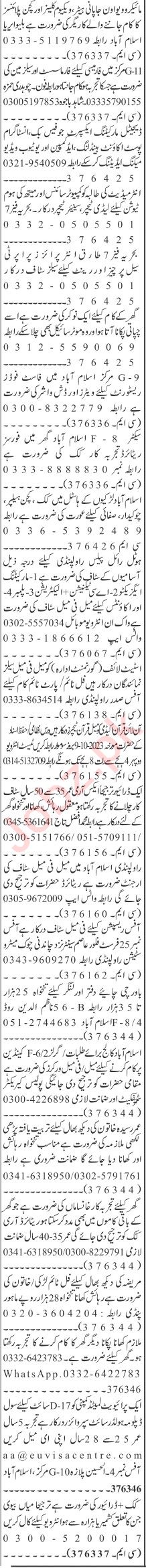 Private Company Islamabad, rawalpindi Islamabad Pakistan invites applications from eligible candidates for the post of site supervisor, office receptionist, female worker, fast food cook, teacher, accounts clerk, quran teacher, electrician, sales representative, pharmacist, real estate agent, kitchen helper, marketing executive, driver, plumber, husband wife, khansama, chowkidar, sales staff, house maid, patient care, cook, salesman, ac technician, sweeper, dishwasher, lady teacher, digital marketing expert, attendant and waiter as per advertisement of October 9, 2023 published in daily Jang Newspaper. Educational qualifications required M.sc, B.E, Matric, Bachelor, BA, B Pharmacy, Middle, I.com, DAE, B.com, Intermediate and MA etc.