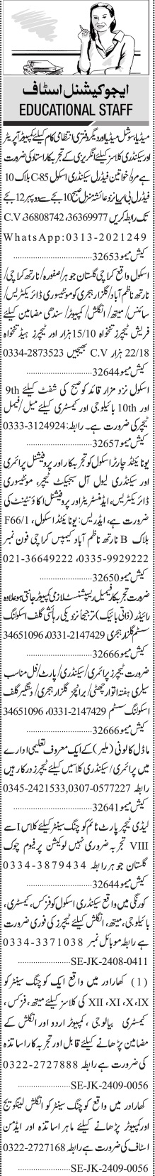 Jang Sunday Classified Ads 8 Sep 2024 For School Staff