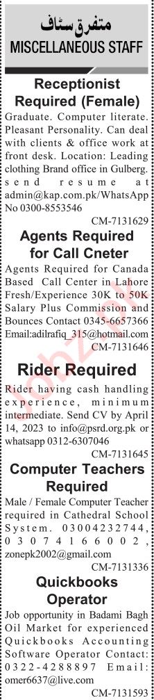 Private Company Lahore, lahore Punjab Pakistan invites applications from eligible candidates for the post of female teacher, receptionist, quick books operator, female receptionist, accounting software operator, computer teacher, rider, call center agent and teacher as per advertisement of April 10, 2023 published in daily Jang Newspaper. Intermediate, MS, B.com, M.sc, Matric and Bachelor etc. educational qualification will be preferred.