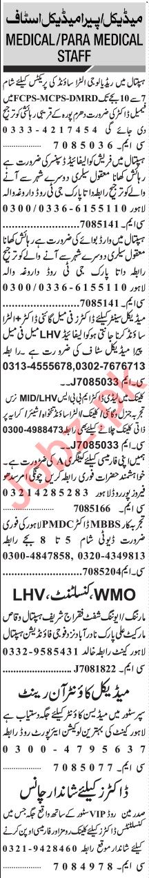 Medical Officer, Radiologist, Nurse, LHV, Doctor, Lady Doctor, Pharmacist, Midwife, Gynecologist, Receptionist, Dispenser, Resident Medical Officer, Pathologist, ICU Technician, CT Scan Technician, X Ray Technician, House Officer, Nursing Instructor, CCTV Assistant, Lab Technician seeks in well reputed hospitals.