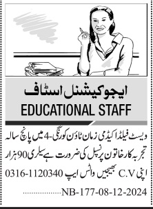 Jang Sunday Classified Ads 9 Dec 2024 For Educational Staff