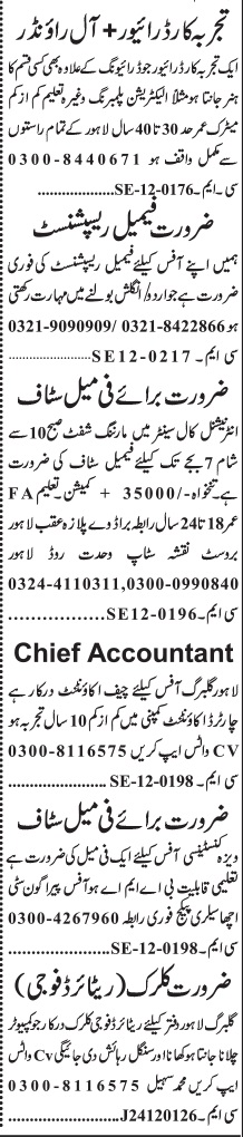 Private Company jobs advertisement dated about 9 December 2024 in daily Jang Newspaper invites application for the vacant post of receptionist, clerk, plumber, driver, ltv driver, fauji clerk, visa consultant, electrician, chief accountant, accountant, female receptionist and call center agent in Lahore, lahore Punjab Pakistan. Educational qualifications required Bachelor, BA, MA, Middle, Matric, Intermediate and B.com etc.