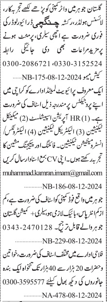 Private Company jobs advertisement dated about 9 December 2024 in daily Jang Newspaper invites application for the vacant post of rikshaw driver, hr operation specialist, driver, mechanical technician, loader, electronics technician, instrumentation technician, factory staff, electrical technician, ngo staff and office staff in Karachi, karachi Sindh Pakistan. Persons with B.E, Middle, DAE, Intermediate, Matric, Bachelor and BA etc. education can apply.