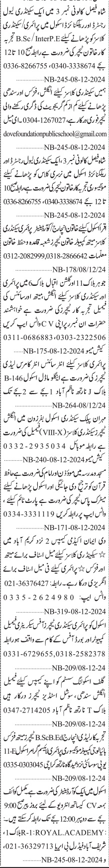 Jang Sunday Classified Ads 9 Dec 2024 For School Staff