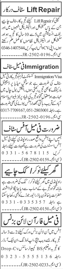 Private Company jobs advertisement dated about 10 February 2025 in daily Jang Newspaper invites application for the vacant post of lift technician, visa consultant, immigration consultant, office assistant, cook, digital marketing expert, office boy, house maid, husband wife, social media marketing expert and driver in Islamabad, rawalpindi Islamabad Pakistan. Persons with Intermediate, Bachelor, BA, Middle and Matric etc. education can apply.