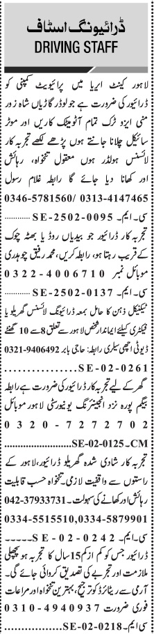 Jang Sunday Classified Ads 9 Feb 2025 For Driving Staff