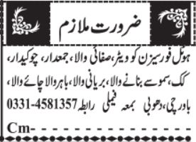 Hotel Quetta, quetta Balochistan Pakistan invites applications from eligible candidates for the post of bawarchi, chowkidar, cook, waiter, sweeper and dhoobi as per advertisement of February 10, 2025 published in daily Jang Newspaper. Preferred Education is Primary, Matric and Middle etc.