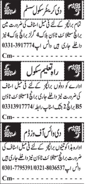 Private School Quetta, quetta Balochistan Pakistan invites applications from eligible candidates for the post of teacher and female teacher as per advertisement of February 10, 2025 published in daily Jang Newspaper. Candidates with Bachelor and Master etc. educational background will be preferred.