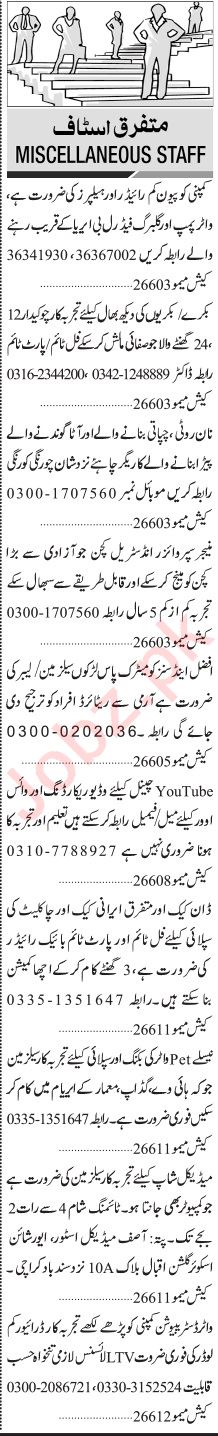 Vacant posts including driver, loader, manager, bike rider, tandoorchi, labor, peon, chowkidar, ltv driver, worker, rider, kitchen supervisor, salesman and helper are announced in Private Company Karachi, karachi Sindh Pakistan as per 10 July 2023 advertisement in daily Jang Newspaper. Candidates with Middle, Matric, BA, Intermediate and Bachelor etc. educational background will be preferred.
