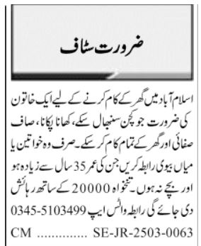 House is looking for candidates for following posts as per job advertisement published in daily Jang Newspaper of March 10, 2025 for location Islamabad, islamabad Islamabad Pakistan: