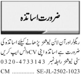 Private School jobs advertisement dated about 10 March 2025 in daily Jang Newspaper invites application for the vacant post of female teacher and teacher in Multan, multan Punjab Pakistan. Preferred Education is Bachelor and Master etc.