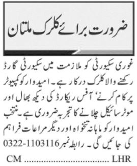 Ghouri Security Guards Multan, multan Punjab Pakistan invites applications from eligible candidates for the post of clerk and security guard as per advertisement of November 10, 2025 published in daily Jang Newspaper. Candidates with Middle, Matric and Intermediate etc. educational background will be preferred.