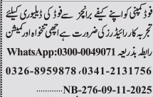 Food Company jobs advertisement dated about 10 November 2025 in daily Jang Newspaper invites application for the vacant post of food delivery rider and rider in Karachi, karachi Sindh Pakistan. Preferred Education is Middle and Matric etc.