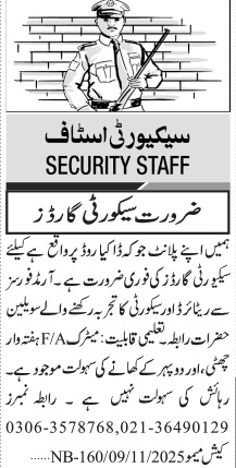 Private Factory jobs advertisement dated about 10 November 2025 in daily Jang Newspaper invites application for the vacant post of security guard and security staff in Karachi, karachi Sindh Pakistan. Persons with Matric and Intermediate etc. education can apply.