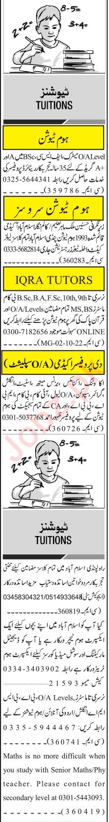 Jang Sunday Classified Ads 9 Oct 2022 for Home Tutor