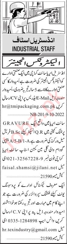 Jang Sunday Classified Ads 9 Oct 2022 For Industrial Staff