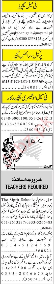 Private School jobs advertisement dated about 10 October 2022 in daily Jang Newspaper invites application for the vacant post of principal, montessori teacher, english language teacher, mathematics teacher, teacher, islamiat teacher, science teacher, female teacher and branch head in Rawalpindi, islamabad Punjab Pakistan. Persons with Bachelor, Master and Intermediate etc. education can apply.