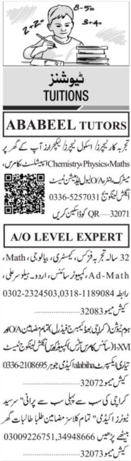 Academy Karachi, karachi Sindh Pakistan invites applications from eligible candidates for the post of physics teacher, a level teacher, chemistry teacher, female teacher, home tutor, english language teacher, teacher, o level teacher, maths teacher, tutor, school teacher and lecturer as per advertisement of August 4, 2024 published in daily Jang Newspaper. Persons with MA, M.sc, Bachelor and Master etc. education can apply.