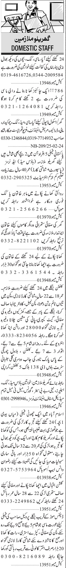 Jang Sunday Classified Domestic Staff Jobs 2024 in Karachi