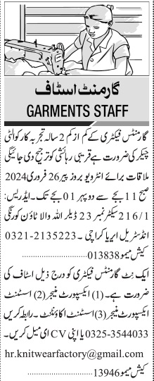 Jang Sunday Classified Garments Staff Jobs 2024 in Karachi