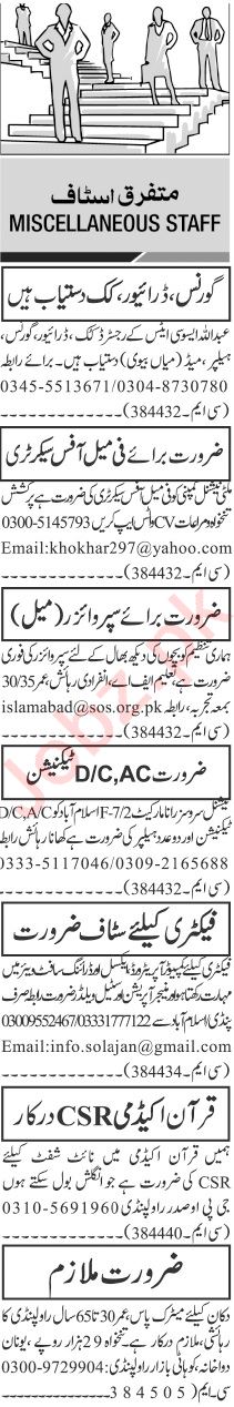 Private Company Islamabad, rawalpindi Islamabad Pakistan invites applications from eligible candidates for the post of computer operator, office secretary, husband wife, cook, helper, driver, csr, governance, supervisor, steel welder, maid, manager operation, ac technician, sales staff and customer service representative as per advertisement of May 19, 2024 published in daily Jang Newspaper. Preferred Education is Bachelor, DAE, BA, Middle, Matric and Intermediate etc.