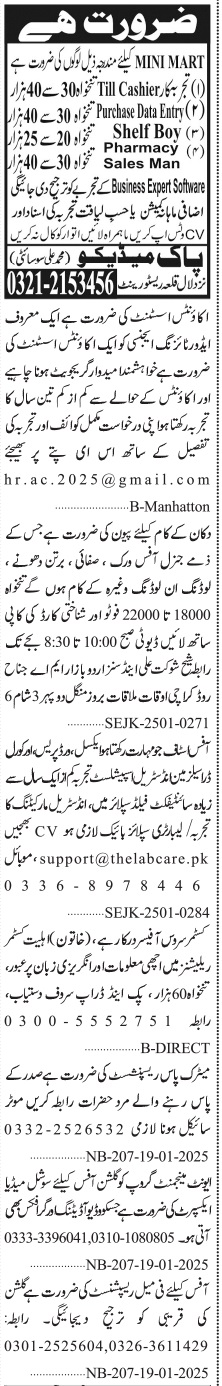 Vacant posts including field supplier, graphic designer, customer relations officer, till cashier, cro, pharmacy salesman, accounts assistant, office staff, purchase data entry, social media expert, salesman, shelf boy, receptionist and peon are announced in Private Company Karachi, karachi Sindh Pakistan as per 20 January 2025 advertisement in daily Jang Newspaper. B.com, BA, Intermediate, Matric, BBA, Middle and Bachelor etc. educational qualification will be preferred.