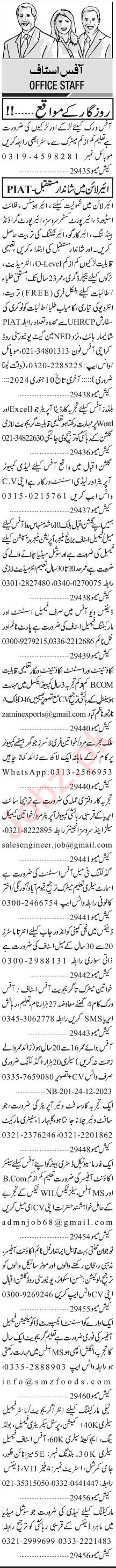 Private Company Karachi, karachi Sindh Pakistan invites applications from eligible candidates for the post of software operator, accountant, lady computer operator, air hostess, flight steward, assistant export officer, assistant, computer operator, social media officer, airport customer services, assistant accountant, marketing staff, office staff, air ticketing staff, lady assistant, receptionist, data operator, account officer, operation manager, social media manager, female office staff, personal secretary, office boy, branch manager, office assistant, female assistant and airport ground handling staff as per advertisement of December 24, 2023 published in daily Jang Newspaper. Bachelor, Matric, Middle, B.com, I.com, Intermediate, BA and BBA etc. educational qualification will be preferred.