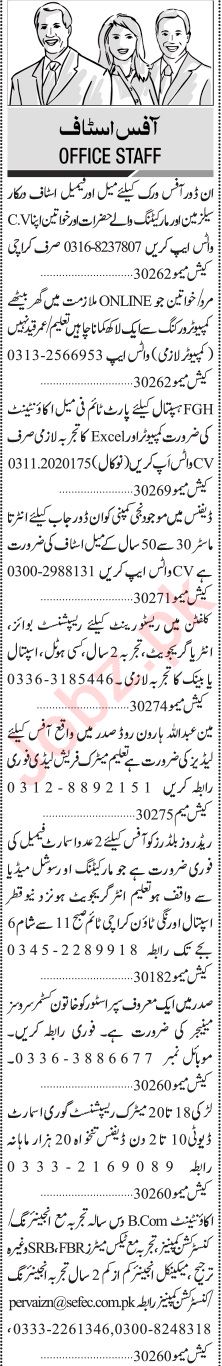 Vacant posts including mechanical engineer, engineer, salesman, customer services manager, marketing staff, marketing officer, accountant, receptionist, social media marketing officer, online staff and office staff are announced in Private Company Karachi, karachi Sindh Pakistan as per 31 March 2024 advertisement in daily Jang Newspaper. Preferred Education is Matric, Intermediate, B.E, Middle, B.com, BA, Bachelor, BBA and DAE etc.