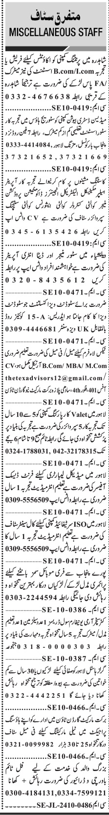 Private Company Lahore, lahore Punjab Pakistan invites applications from eligible candidates for the post of store manager, front desk officer, assistant, driver, field worker, quality controller, cook, bawarchi, data entry operator, hostel worker, accounts assistant, quality assurance supervisor, store assistant, attendant, stitching supervisor, machine operator, visa consultant, telemarketing officer, documentation manager, supervisor, mechanical engineer, tax accountant, call center agent, production manager, salesman, electrical engineer, helper and accounts officer as per advertisement of October 14, 2024 published in daily Jang Newspaper. Persons with Matric, Bachelor, Middle, Intermediate, BA, B.com and BBA etc. education can apply.