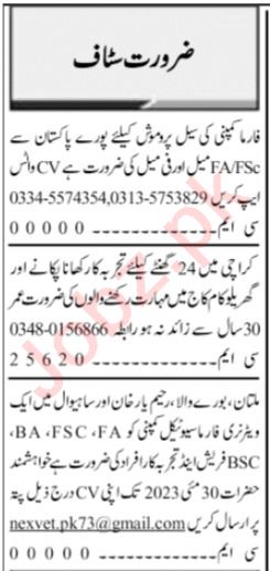Private Company invites applications for job positions advertised in daily Jang dated 22 May 2023 for following vacancies in Multan, sahiwal, rahim yar khan, multan and burewala Punjab Pakistan.