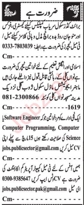 Private Company Quetta, quetta Balochistan Pakistan invites applications from eligible candidates for the post of chemistry teacher, computer programmer, teacher, accountant, physics teacher, computer operator, female teacher, software engineer and english teacher as per advertisement of March 6, 2023 published in daily Jang Newspaper. Candidates with Matric, Master, Intermediate and Bachelor etc. educational background will be preferred.