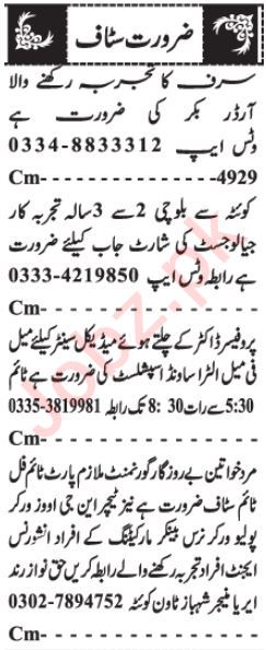 Private Company Quetta, quetta Balochistan Pakistan invites applications from eligible candidates for the post of ngo worker, geologist, teacher, order booker, polio worker, office staff, nurse, marketing officer, banker and ultrasound specialist as per advertisement of June 9, 2024 published in daily Jang Newspaper. Candidates with Middle, Intermediate, Matric, BA and Bachelor etc. educational background will be preferred.