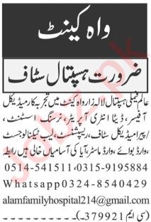 Alam Hospital Wah Cant invites applications for job positions advertised in daily Jang dated 7 January 2024 for following vacancies in Wah Cantt, wah cantt Punjab Pakistan.