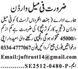 Jannat Ul Firdous Trust Lahore Jobs 2026 For Female Warden