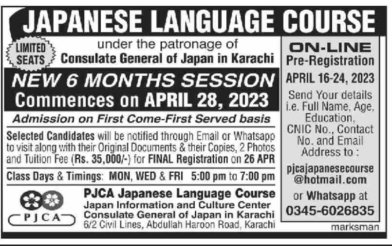 Japan Information And Culture Center Japanese Language Course admissions 2023 has been announced. Students who want to take admissions in Japan Information And Culture Center Karachi Sindh Pakistan for academic year 2023 to continue education in Language College can apply. Eligible students for fulfilling criteria for admissions in Course can enroll as per Private admission policy 2023 till closing date 26 April 2023. Read newspaper ad for exact details.