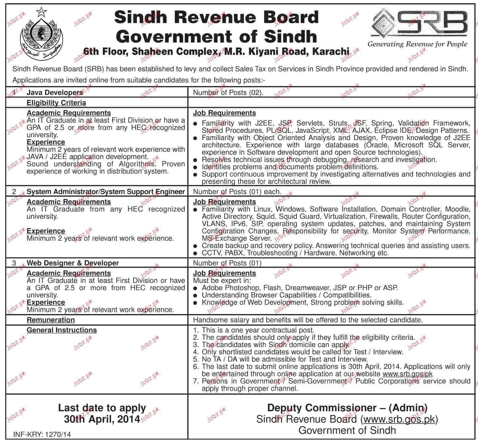 Java Developers, System Administrators and System Support Engineers are required in Sindh Revenue Board in Karachi