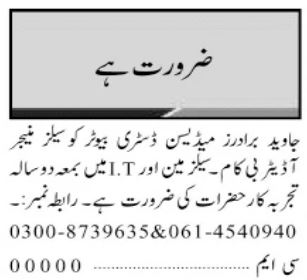 Javaid Brothers Distributors is looking for candidates for following posts as per job advertisement published in daily Jang Newspaper of March 18, 2022 for location Multan, multan Punjab Pakistan: