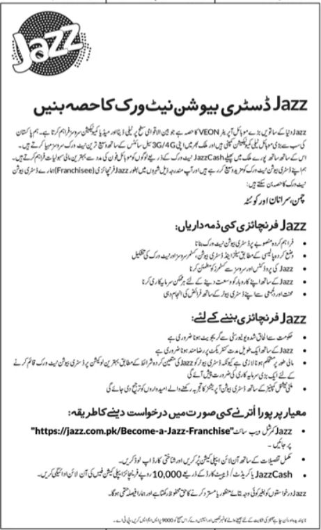 Vacant posts including jazz distribution and jazz franchise are announced in Jazz Franchise Quetta, quetta Balochistan Pakistan as per 2 March 2025 advertisement in daily Jang Newspaper. Candidates with Bachelor and Master etc. educational background will be preferred.