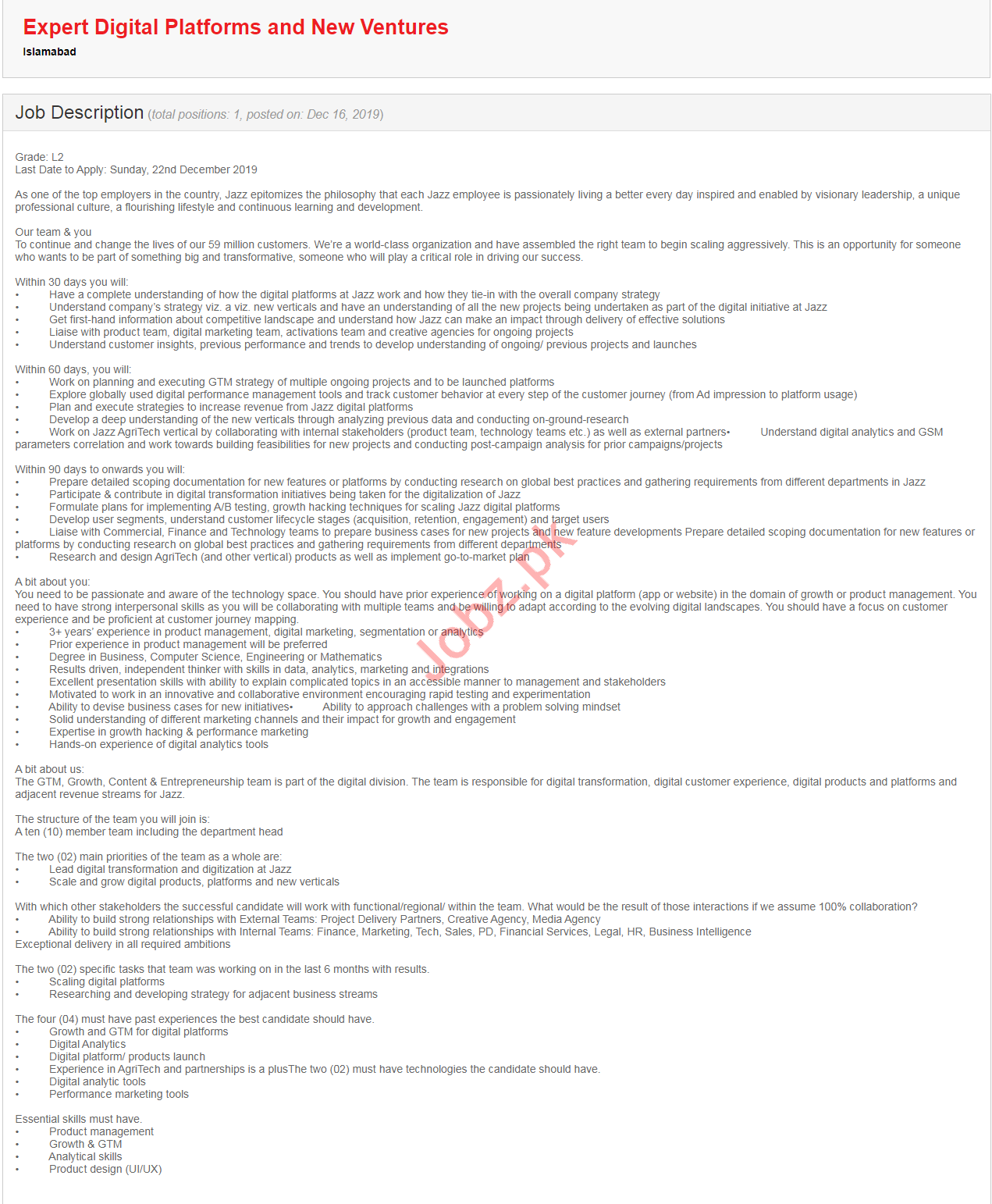 Jazz Telecommunication Company Jobs 2020 in Islamabad