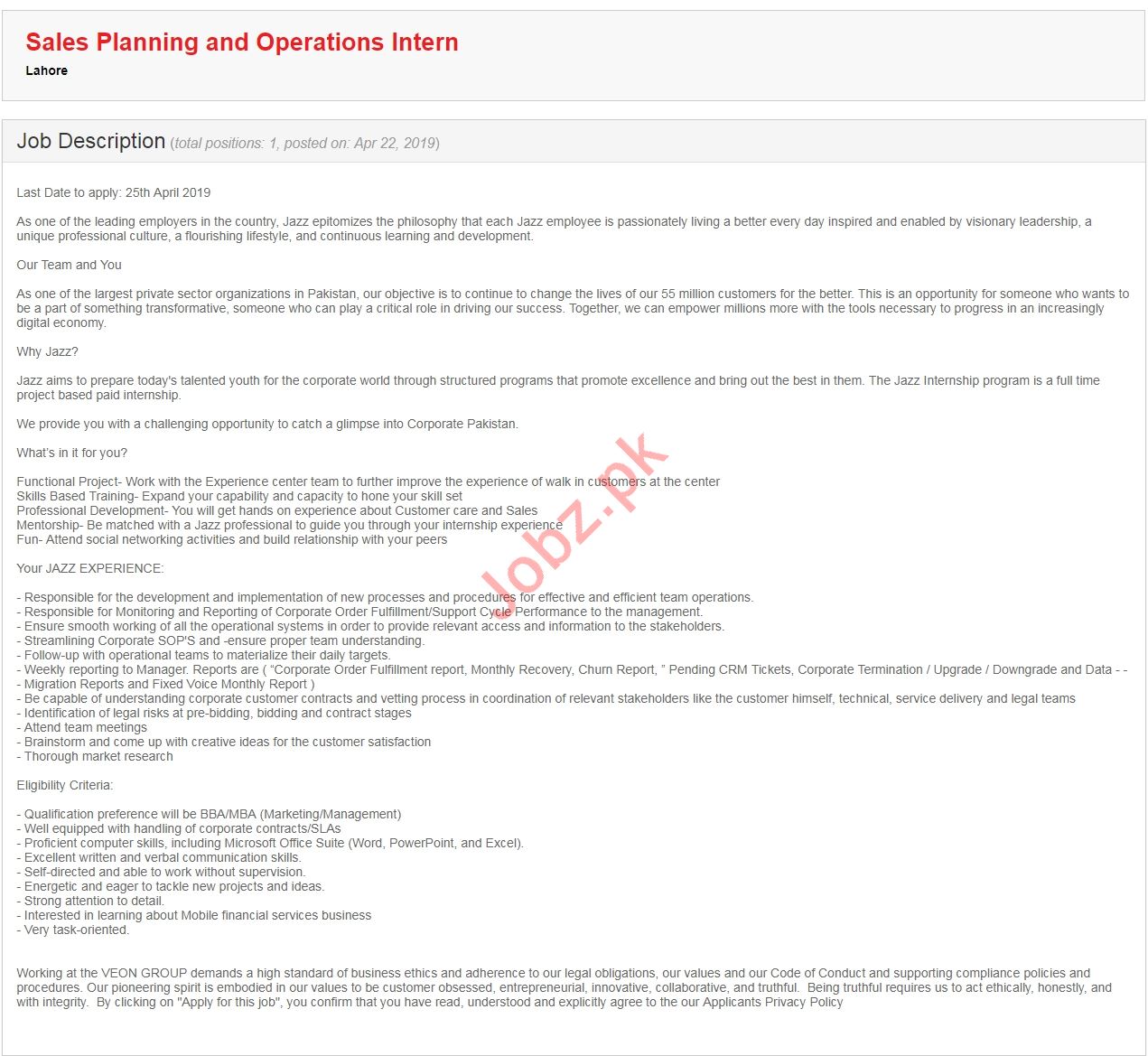 Latest Jazz Telecom Internship Posts Lahore 2025