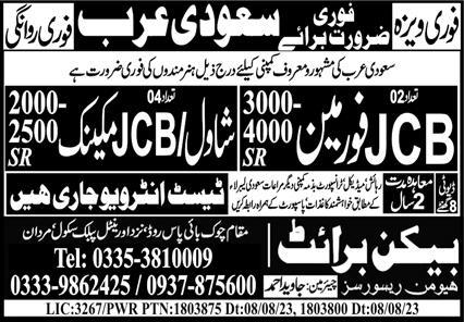 Vacant posts including jcb mechanic, shawl mechanic and jcb foreman are announced in Beacon Bright Human Resources Riyadh, jeddah Saudi Arabia as per 10 August 2023 advertisement in daily Express Newspaper. Matric, Bachelor, DAE, B.E and Intermediate etc. educational qualification will be preferred.