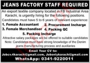 Textile Company Karachi, karachi Sindh Pakistan invites applications from eligible candidates for the post of female merchandiser, packing incharge, packing qc, female accountant and procurement incharge as per advertisement of April 27, 2025 published in daily Jang Newspaper. Intermediate, Bachelor and Master etc. educational qualification will be preferred.