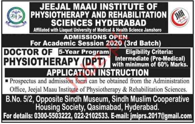 Jeejal Maau Institute Of Physiotherapy And Rehabilitation Sciences Affiliated with Liaquat University of Medical & Health Science is offering admissions for Doctor of Physiotherapy DPT 5 Year Program in Hyderabad. Read newspaper ad for exact details.