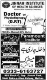 Jinnah Institute of Health Sciences has announced admissions 2022 for Doctor of Physiotherapy DPT, Operation Theatre Technician, Laboratory Technician, Dispenser.. Students who want to take admissions in Jinnah Institute of Health Sciences Multan Punjab Pakistan for academic year 2022 to continue education in Medical Diploma can apply. Eligible candidates for admissions in Diploma and DPT can apply as per Private institute criteria and before closing date 30 September 2022 after reading advertisement online. Read newspaper ad for exact details.