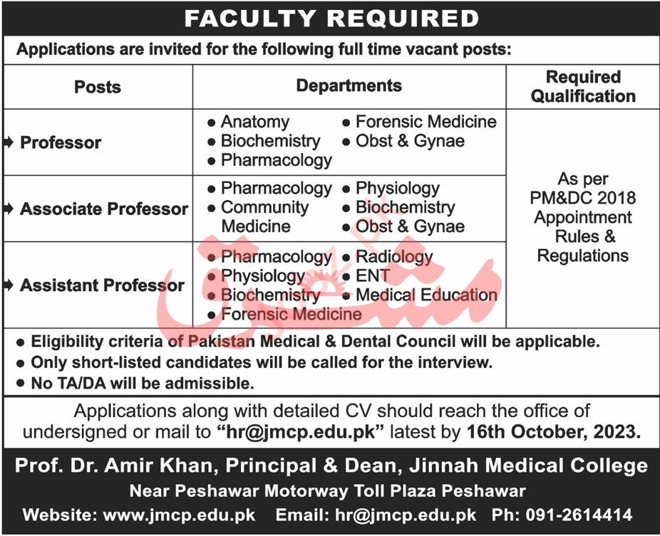 Jinnah Medical College jobs advertisement dated about 9 October 2023 in daily Mashriq Newspaper invites application for the vacant post of associate professor, assistant professor and professor in Peshawar, peshawar Khyber Pakhtunkhwa KPK Pakistan. Persons with Bachelor, Mphil, Phd and Master etc. education can apply.
