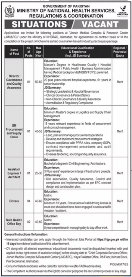 Jinnah Medical Complex & Research Center JMC&RC, Ministry of National Health Services Regulations & Coordination NHSRC jobs advertisement dated about 6 December 2025 in daily Dunya Newspaper invites application for the vacant post of director governance, architect, naib qasid, director quality assurance, assistant engineer, gm supply chain, gm procurement, office boy and driver in Constitution Avenue Islamabad, islamabad Islamabad Pakistan. Candidates with Others, DAE, Master, Matric, Bachelor, B.E and MBBS etc. educational background will be preferred.
