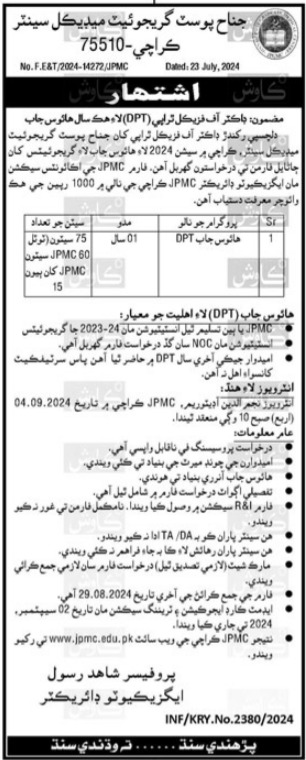 Jinnah Post Graduate Medical Center DPT House Job 2024