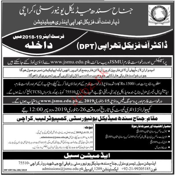 Jinnah Sindh Medical University JSMU Karachi, Pakistan are opened admissions spring 2019 for the classes of DPT Doctor of Physical Therapy and Pharm B. Read newspaper ad for exact details.