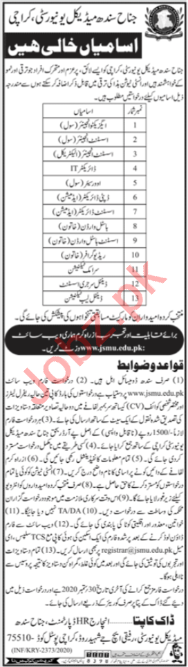 Jinnah Sindh Medical University JSMU Karachi seeks services for Engineer, Civil Engineer, Executive Engineer, Assistant Engineer, Assistant Engineer Civil, Assistant Engineer Electrical, Electrical Engineer, Director, Director IT, Overseer, Overseer Civil, Deputy Director, Deputy Director Admission, Assistant Director, Assistant Director Admission, Hostel Warden, Assistant Hostel Warden, Female Hostel Warden, Radiographer, Ceramic Technician, Dental Surgery Assistant, Dental Lab Technician.