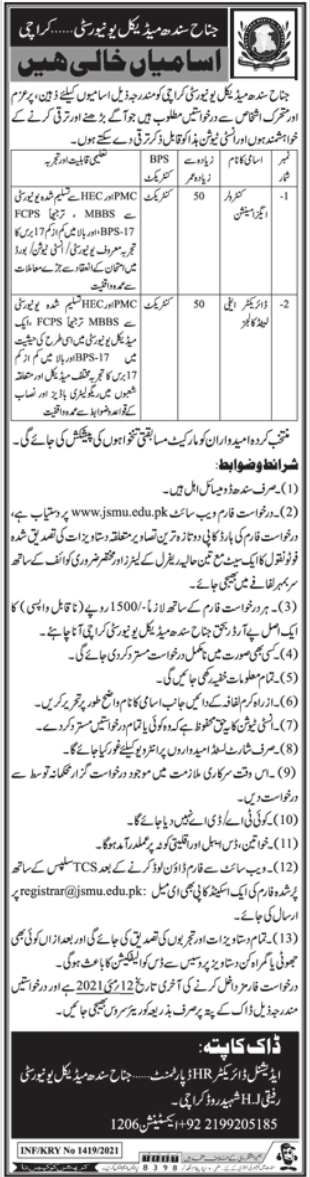 Vacancies in Jinnah Sindh Medical University Advertisement May 2021